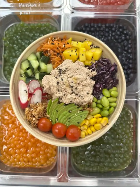base:riz vinaigre :Avocat, edamame, concombre, mais, radis, mangue, oignion frit, carrot, choux rouge, wakame et sesames